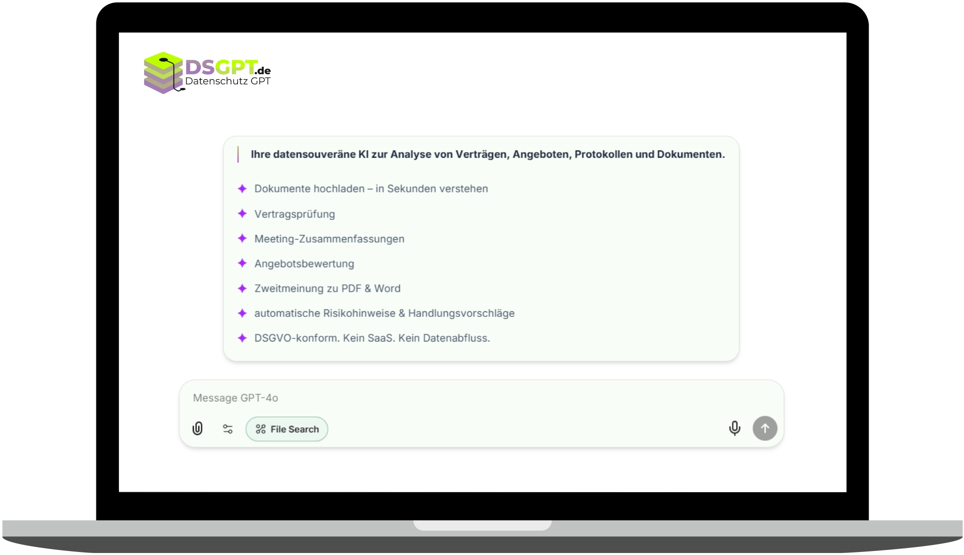 DSGPT ist Ihre eigene KI-Plattform, die speziell an Ihre Anforderungen angepasst werden kann. Einmalige Kosten und dauerhafte Nutzung sorgen für eine langfristige Lösung, die DSGVO-konform ist und sich nahtlos in Ihre vorhandenen Systeme integriert.